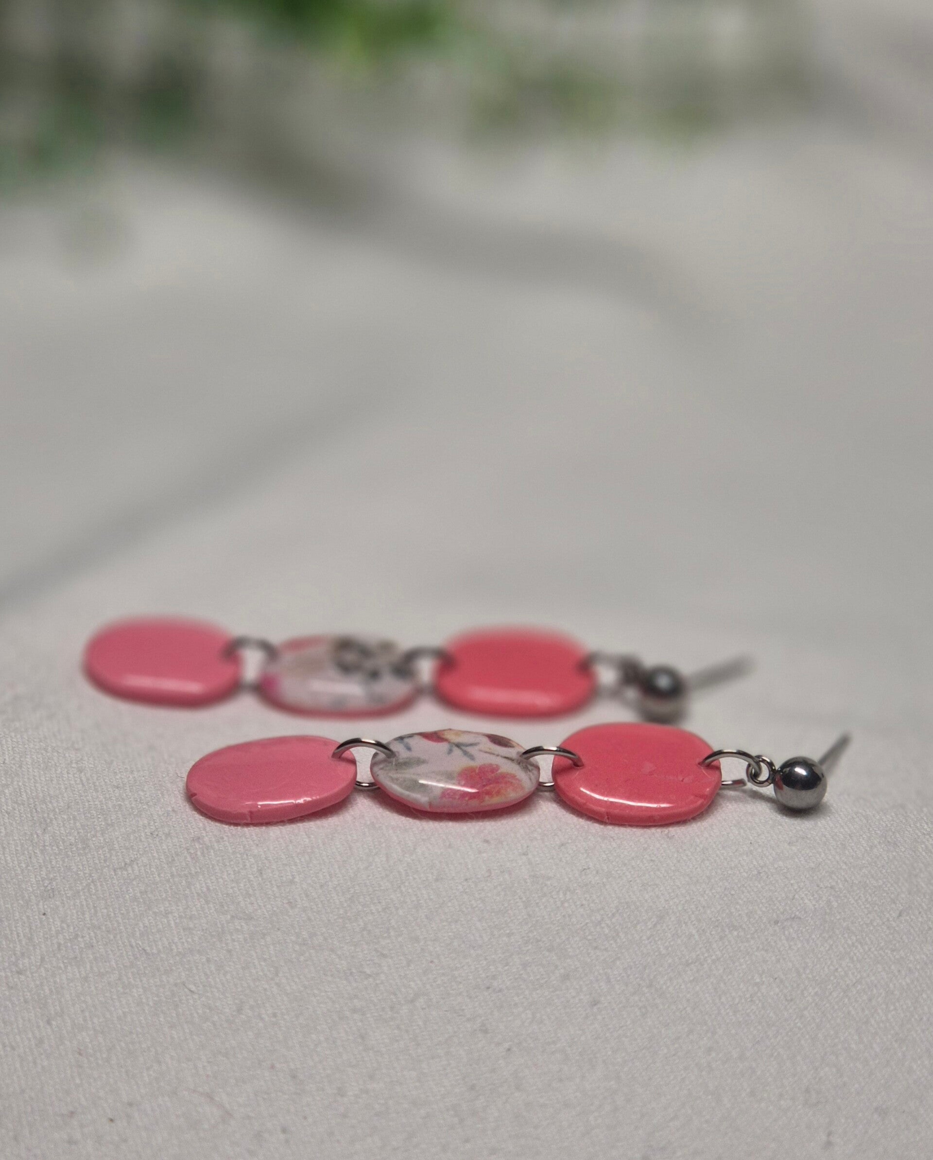 Pendientes de arcilla polimérica en tonos coral combinados con estampado de flores.