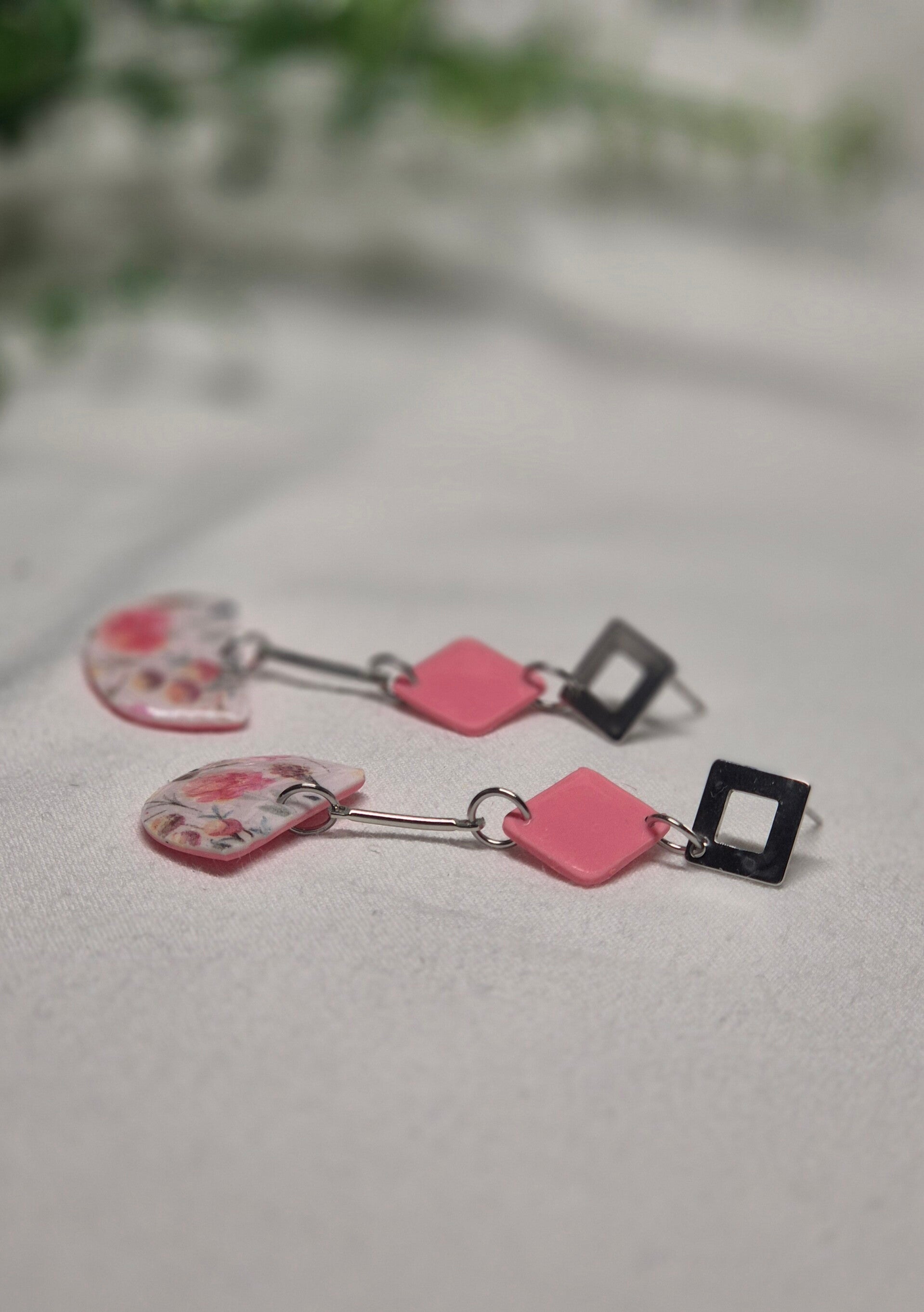 Pendientes de arcilla polimérica en tonos coral combinados con estampado de flores.