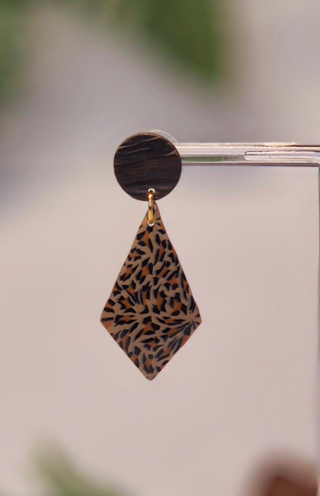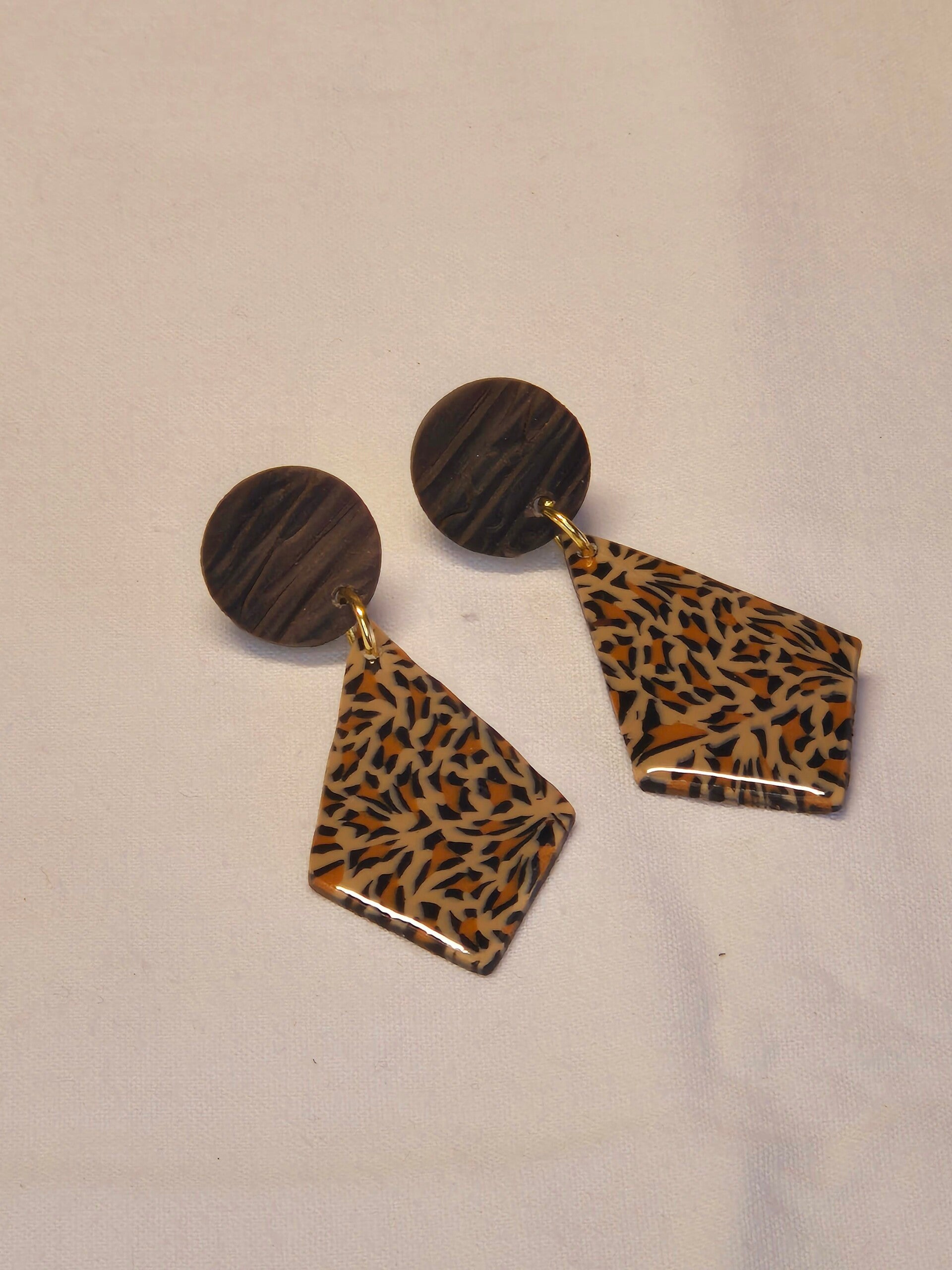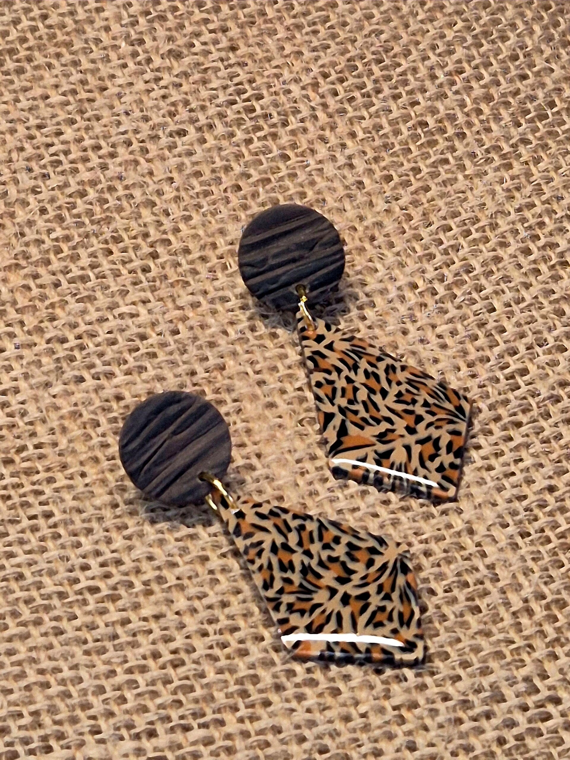 Pendientes hechos de forma artesanal con arcilla polimérica imitando las manchas de la piel de leopardo (animal print) combinado con más arcilla polimérica en tono marrón imitando a la madera.