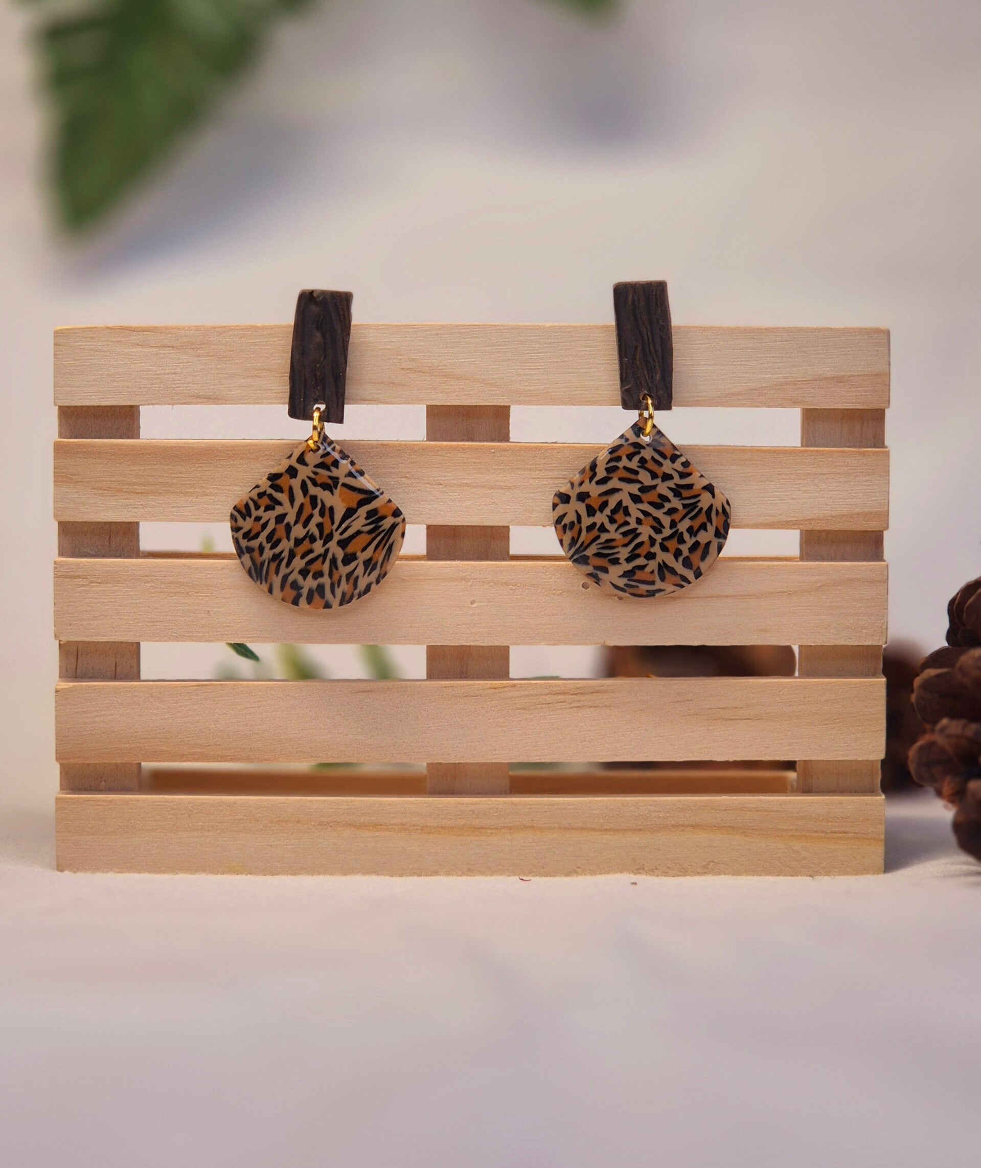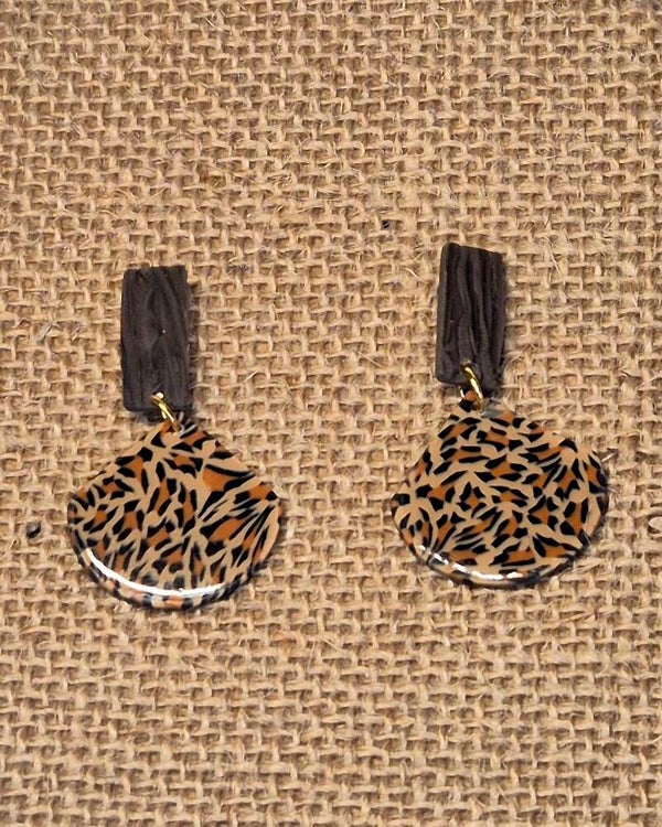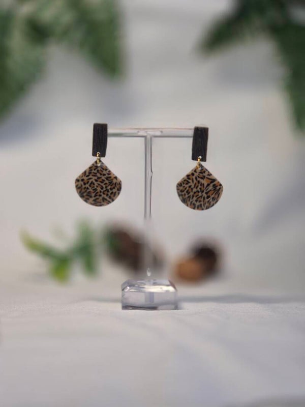 Pendientes hechos de forma artesanal con arcilla polimérica imitando las manchas de la piel de leopardo (animal print) combinado con más arcilla polimérica en tono marrón imitando a la madera.