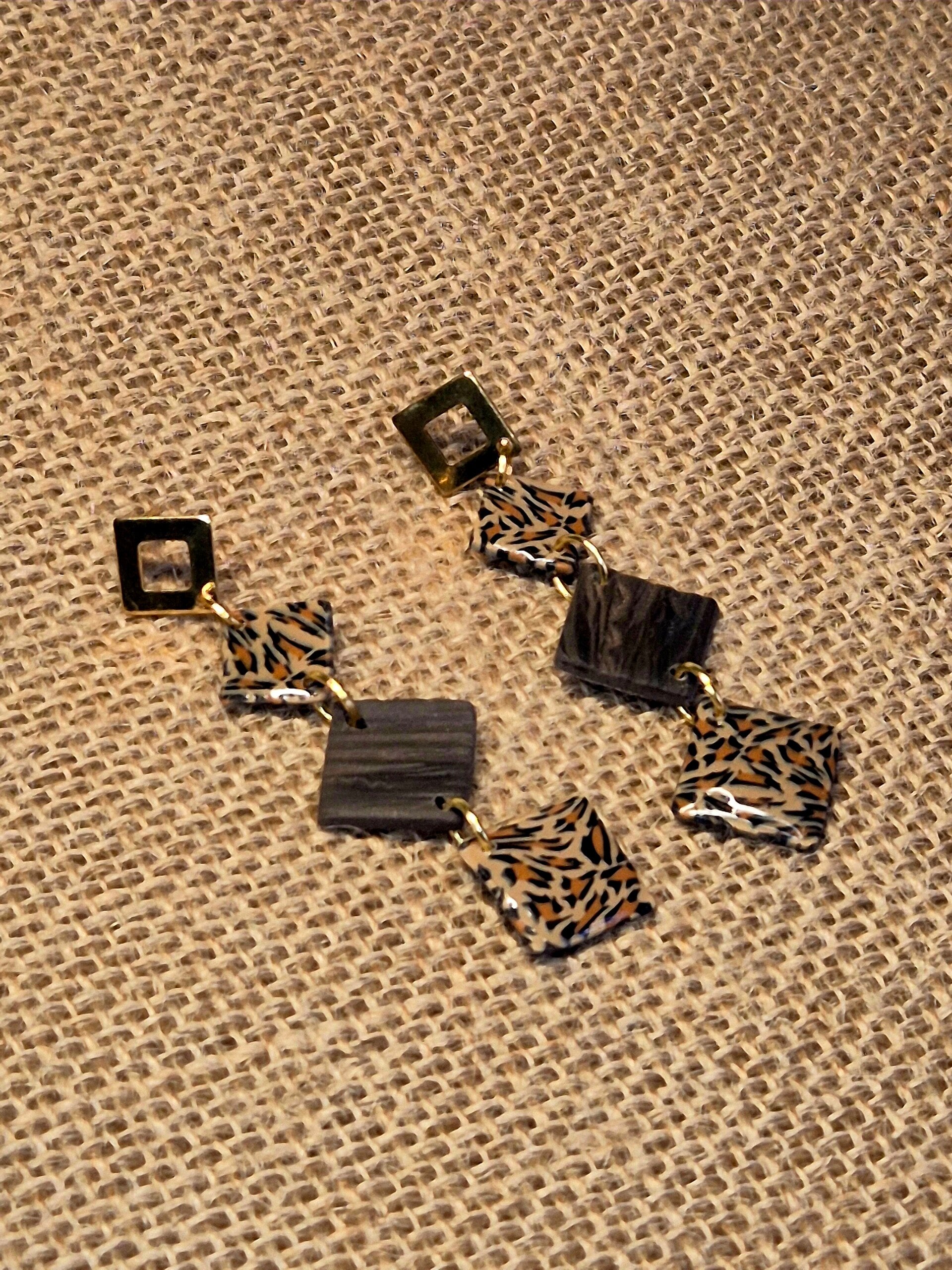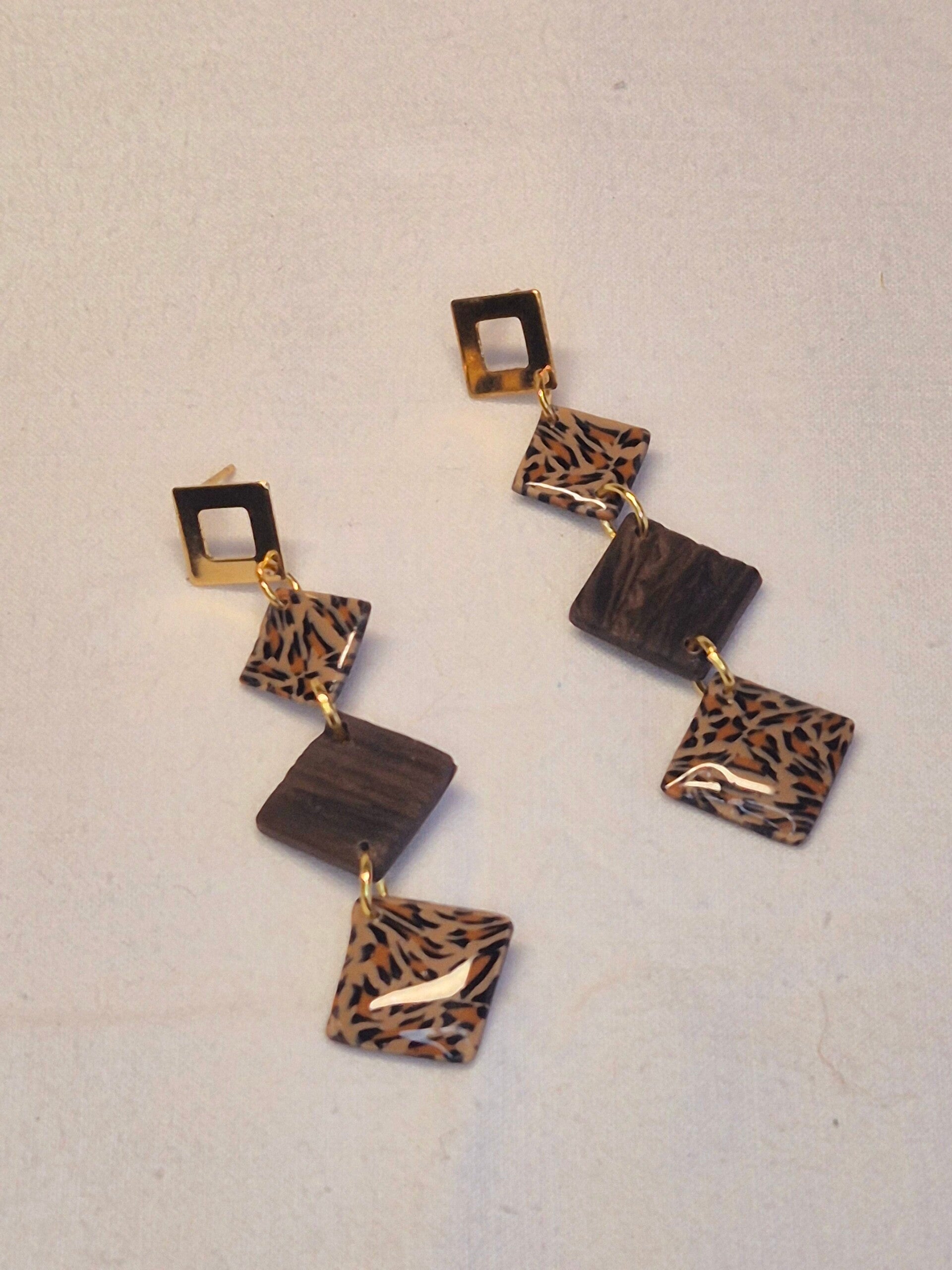Pendientes hechos de forma artesanal con arcilla polimérica imitando las manchas de la piel de leopardo (animal print) combinado con más arcilla polimérica en tono marrón imitando a la madera.