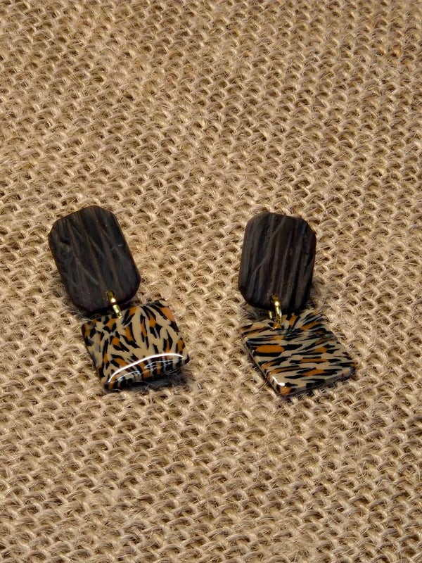Pendientes hechos de forma artesanal con arcilla polimérica imitando las manchas de la piel de leopardo (animal print) combinado con más arcilla polimérica en tono marrón imitando a la madera.