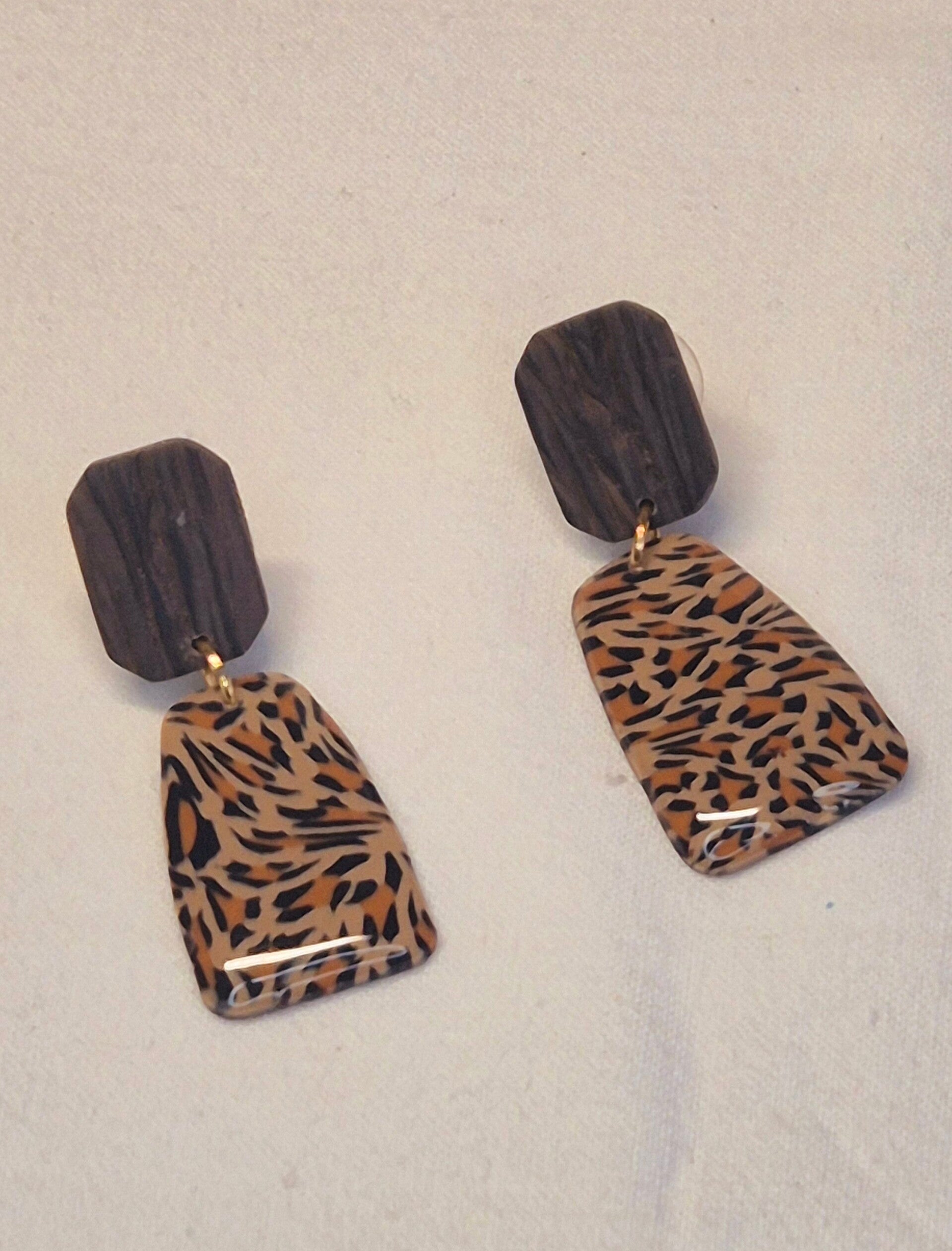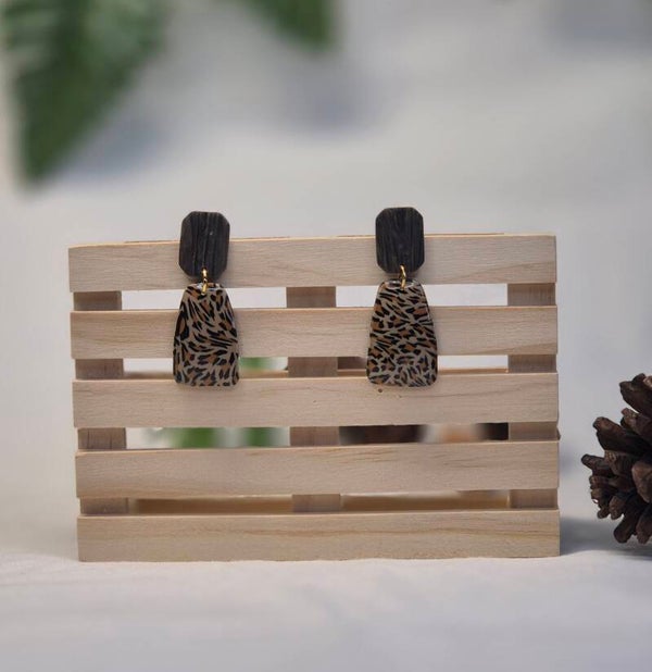 Pendientes hechos de forma artesanal con arcilla polimérica imitando las manchas de la piel de leopardo (animal print) combinado con más arcilla polimérica en tono marrón imitando a la madera.