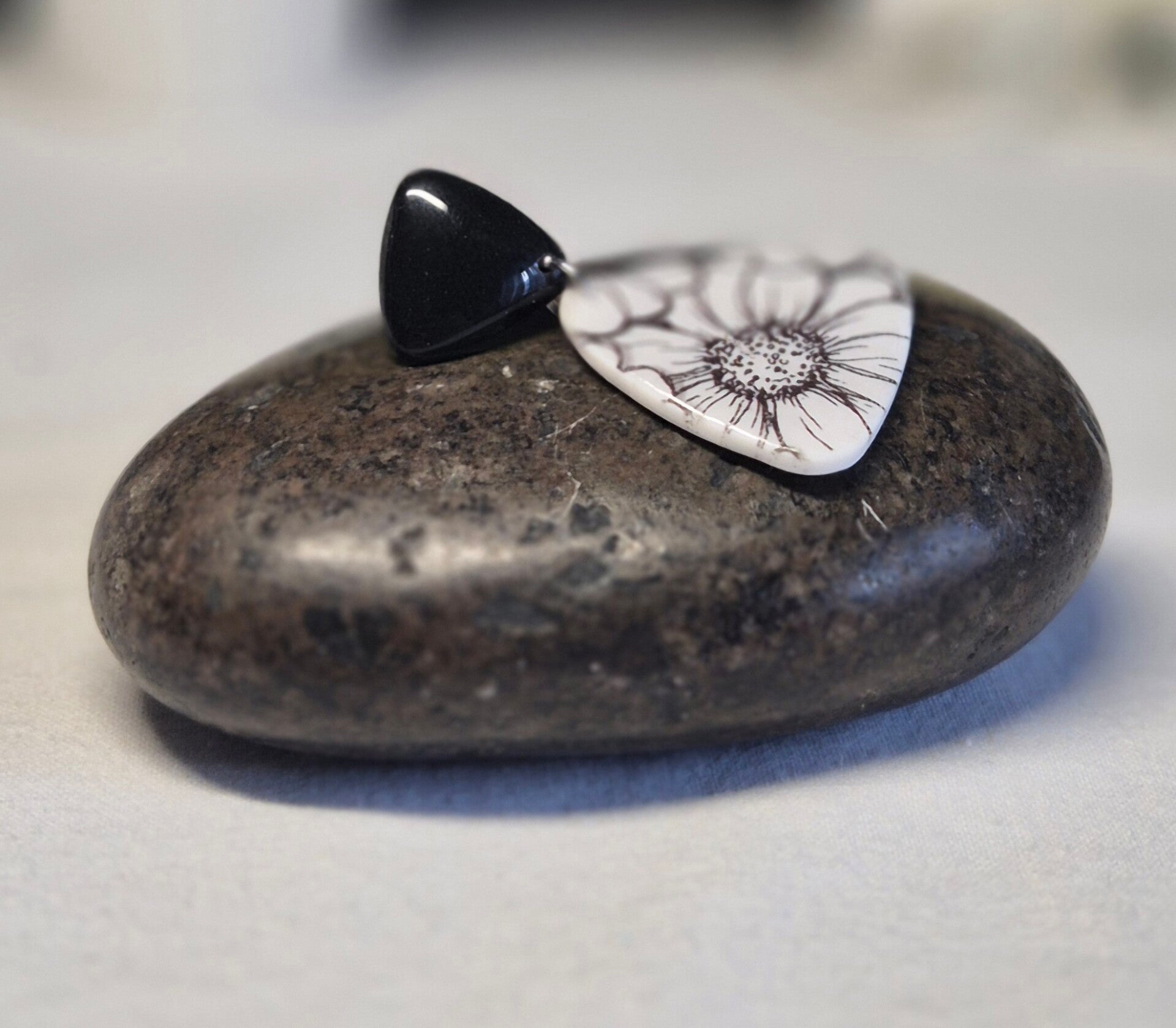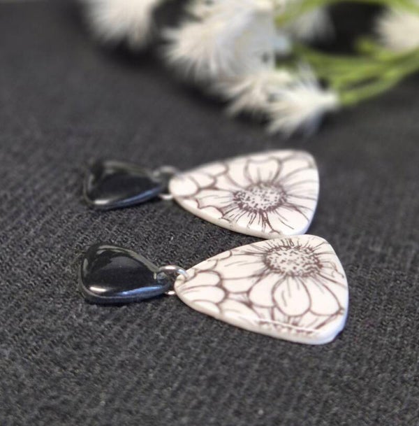 Pendientes artesanales en blanco con silueta de flores en negro y combinado con piezas en negro, recuerdo de las "calcas" que mi madre me enseñó a hacer contra el crital de la ventana.