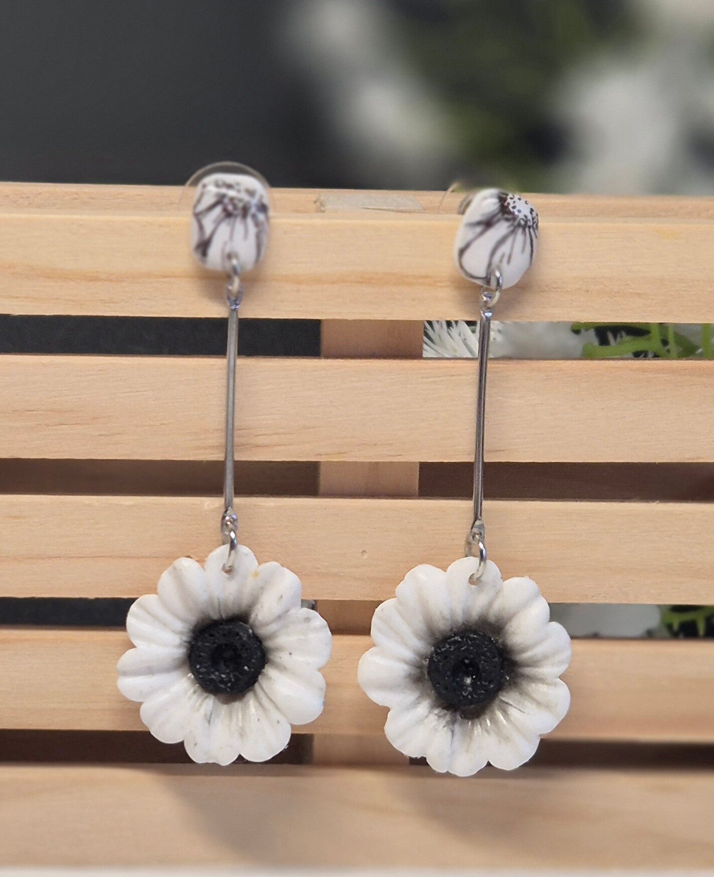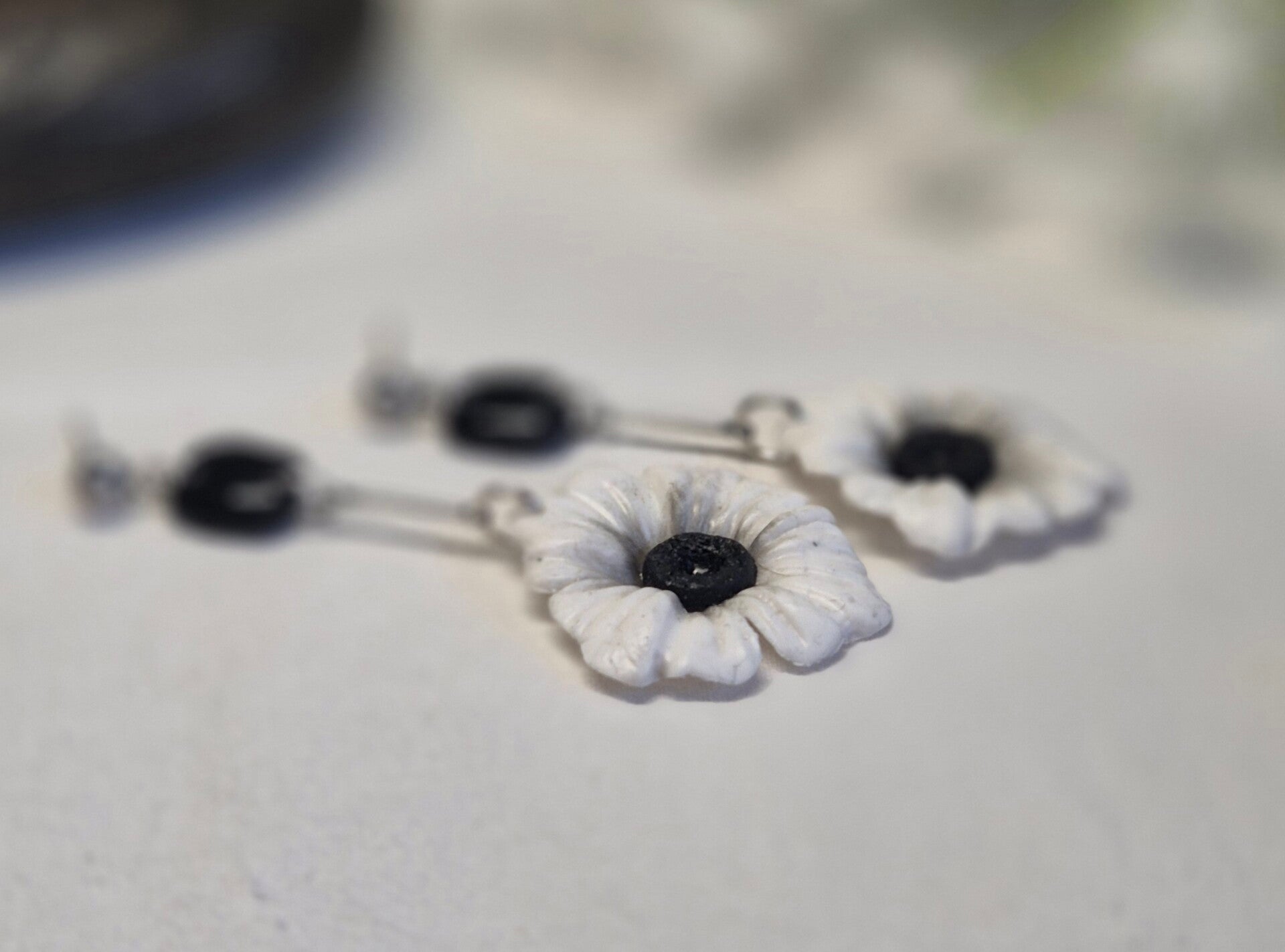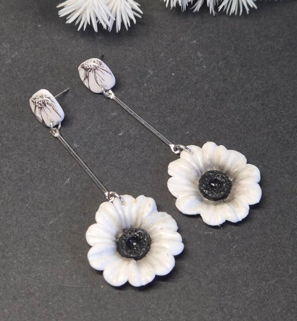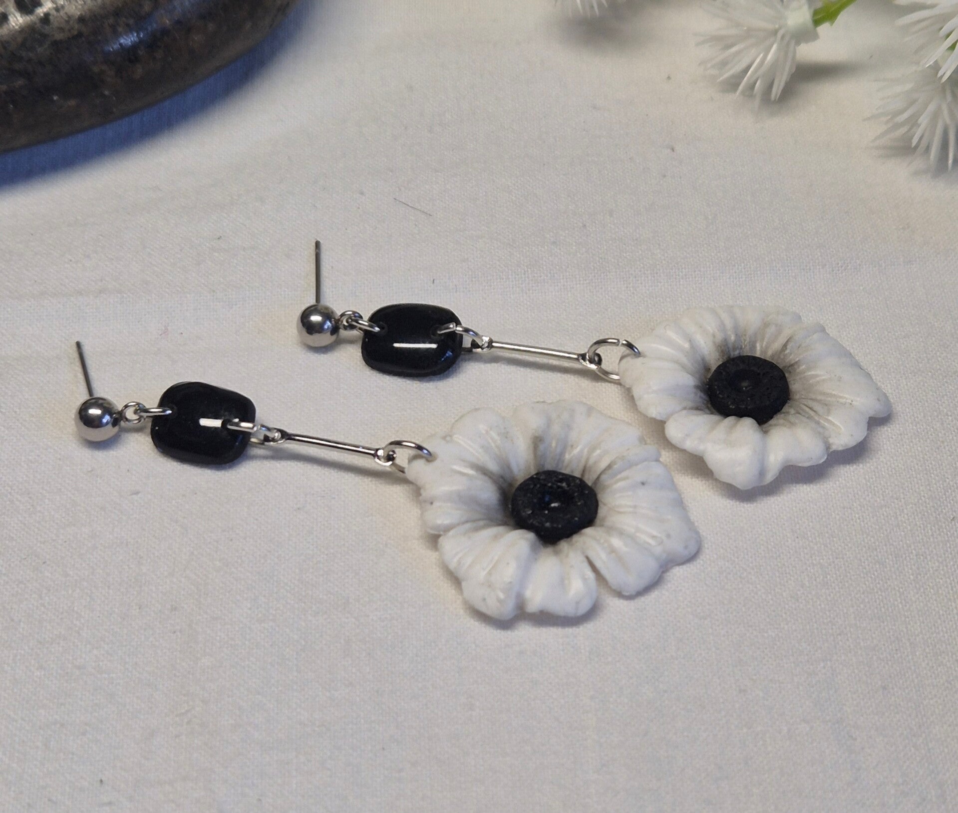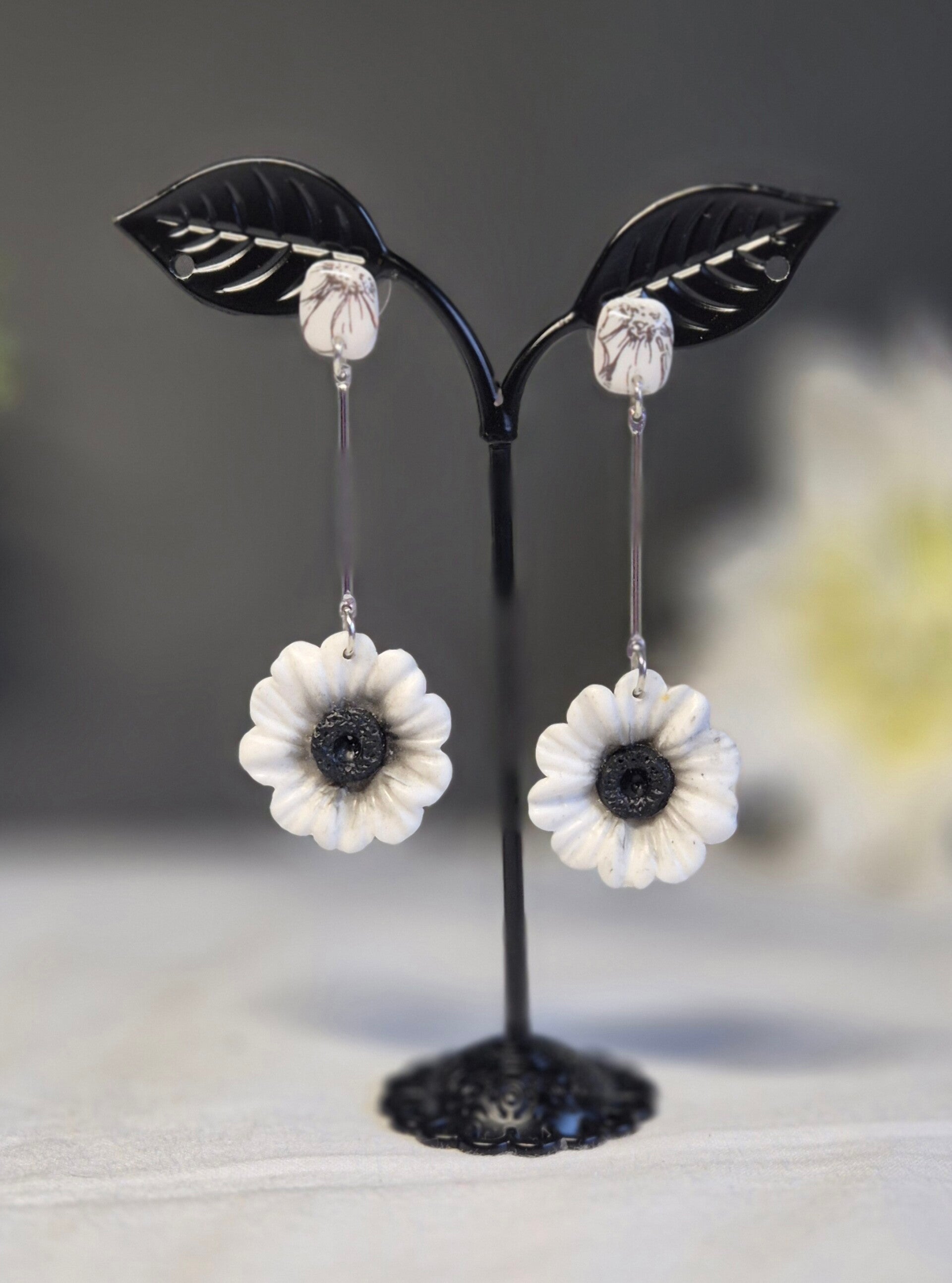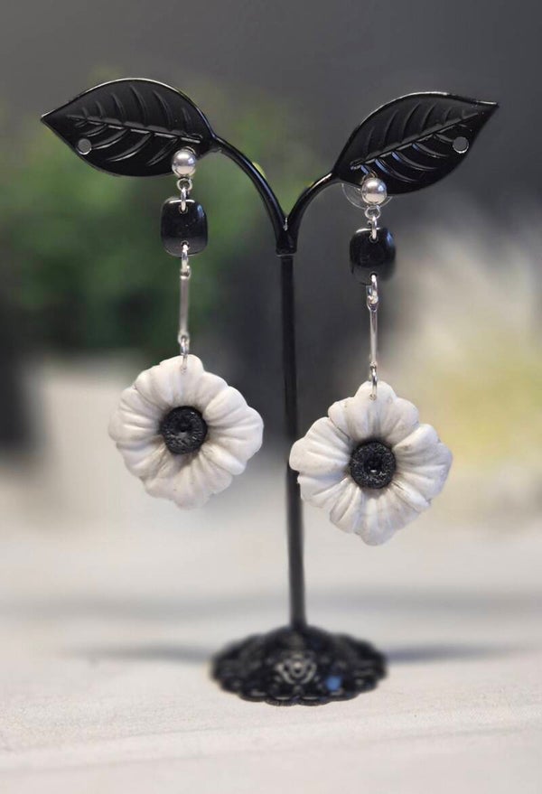 Pendientes artesanales en blanco con silueta de flores en negro y combinado con piezas en negro, recuerdo de las "calcas" que mi madre me enseñó a hacer contra el crital de la ventana.