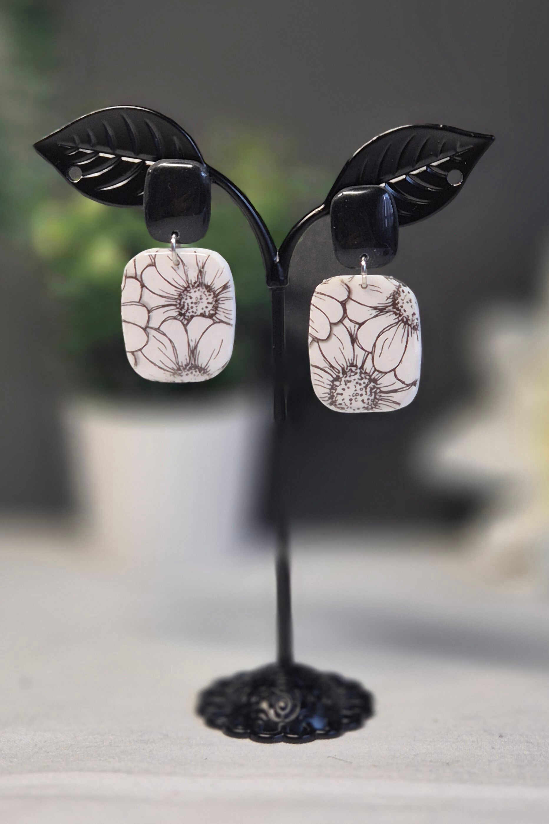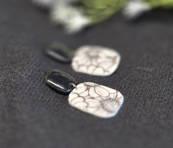 Pendientes artesanales en blanco con silueta de flores en negro y combinado con piezas en negro, recuerdo de las "calcas" que mi madre me enseñó a hacer contra el crital de la ventana.