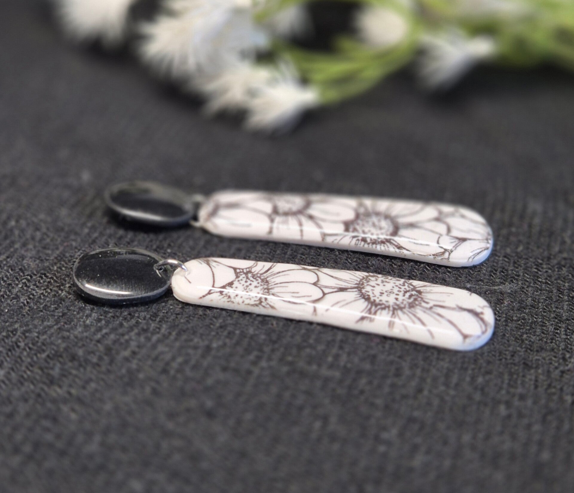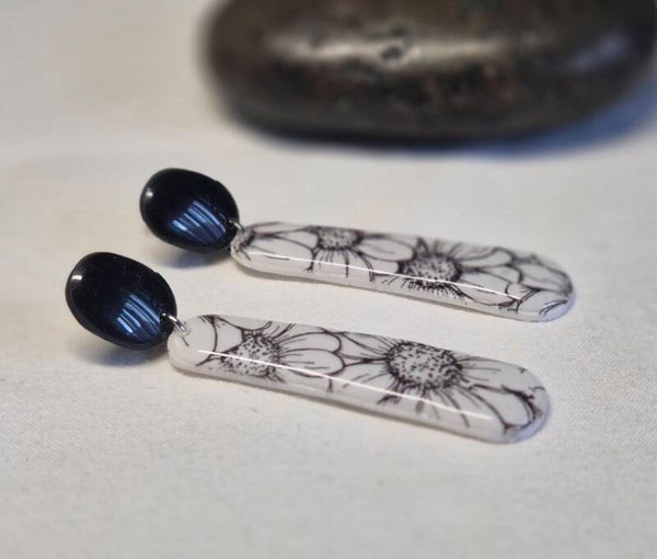 Pendientes artesanales en blanco con silueta de flores en negro y combinado con piezas en negro, recuerdo de las "calcas" que mi madre me enseñó a hacer contra el crital de la ventana.