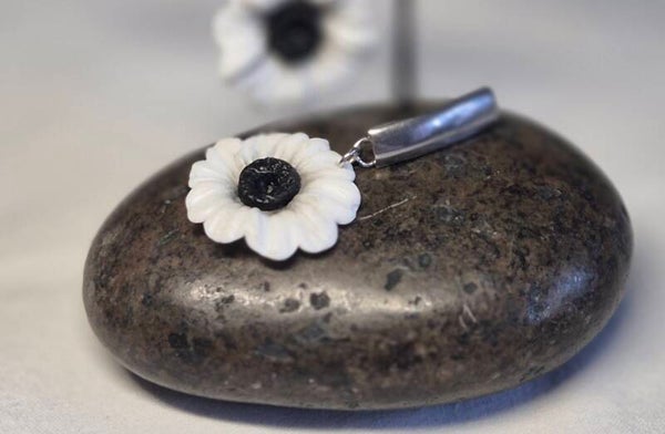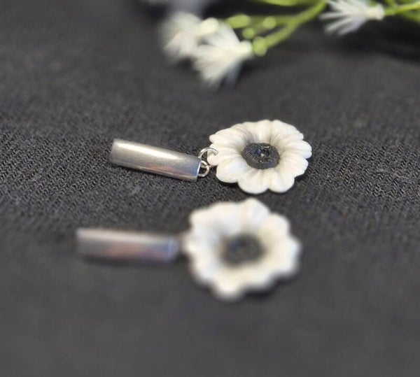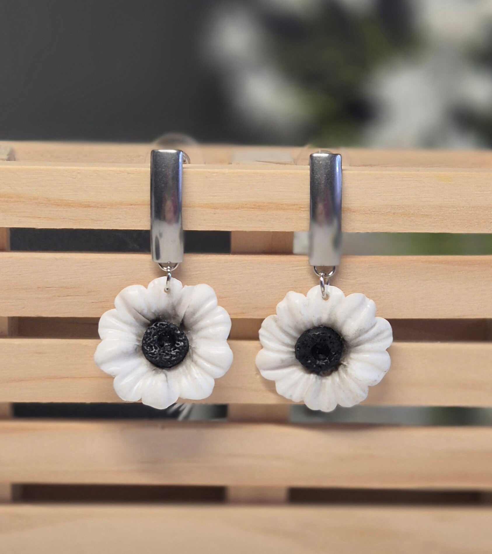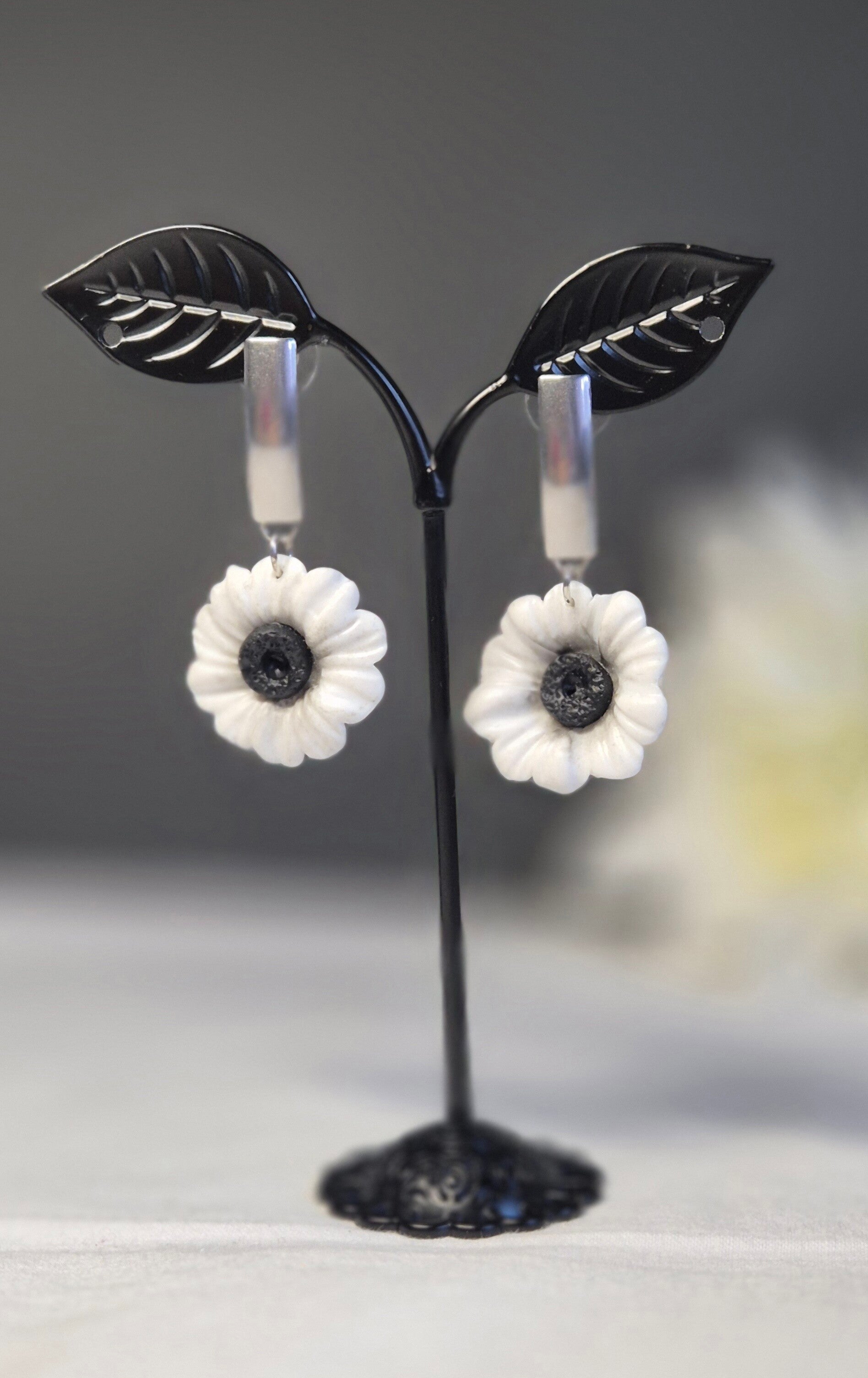 Pendientes artesanales en blanco con silueta de flores en negro y combinado con piezas en negro, recuerdo de las "calcas" que mi madre me enseñó a hacer contra el crital de la ventana.