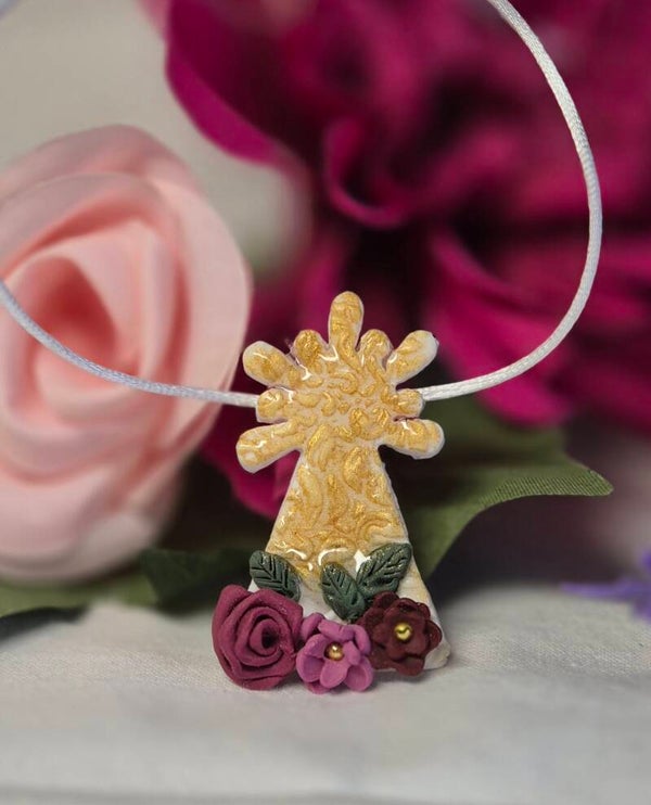 Colgante de la imagen de la Virgen del Pilar, hecho en arcilla polimérica a mano, con todo el cariño y respeto que Ella se merece.