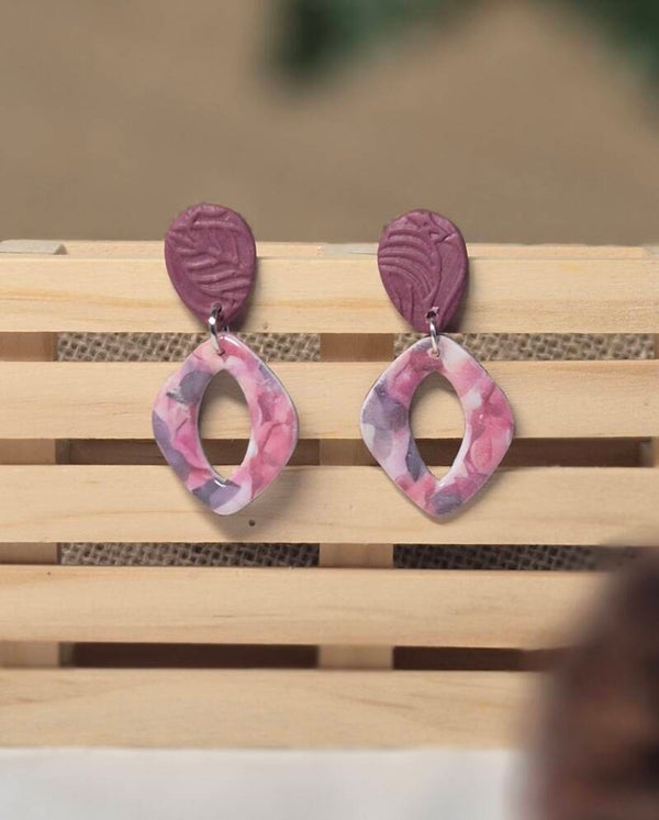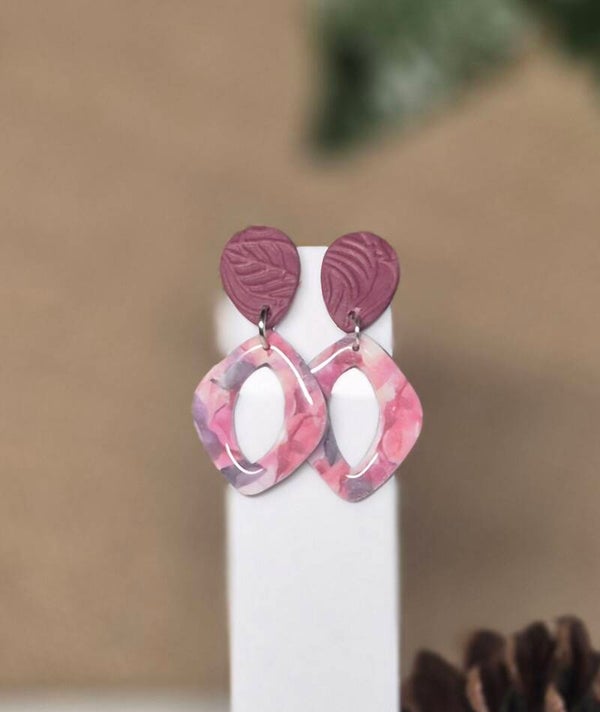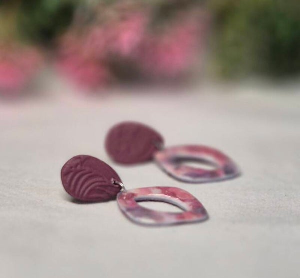 Pendientes hechos a mano con arcilla polimérica en un tono único entre guinda y vino, con una parte lisa y otra con un estampado floral delicado. Ligeros, cómodos y con ese toque especial que convierte cada pieza en un recuerdo transformado en color y forma.