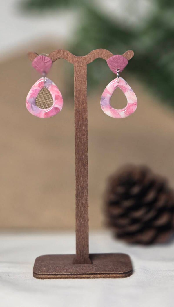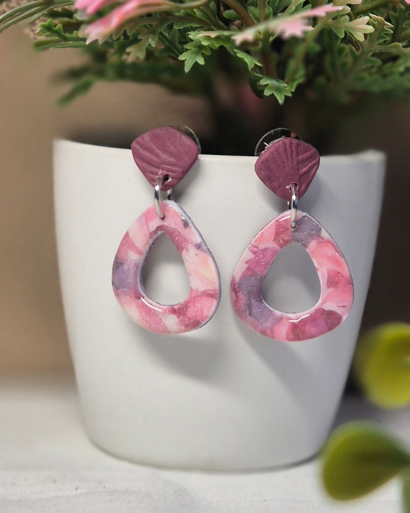 Pendientes hechos a mano con arcilla polimérica en un tono único entre guinda y vino, con una parte lisa y otra con un estampado floral delicado. Ligeros, cómodos y con ese toque especial que convierte cada pieza en un recuerdo transformado en color y forma.