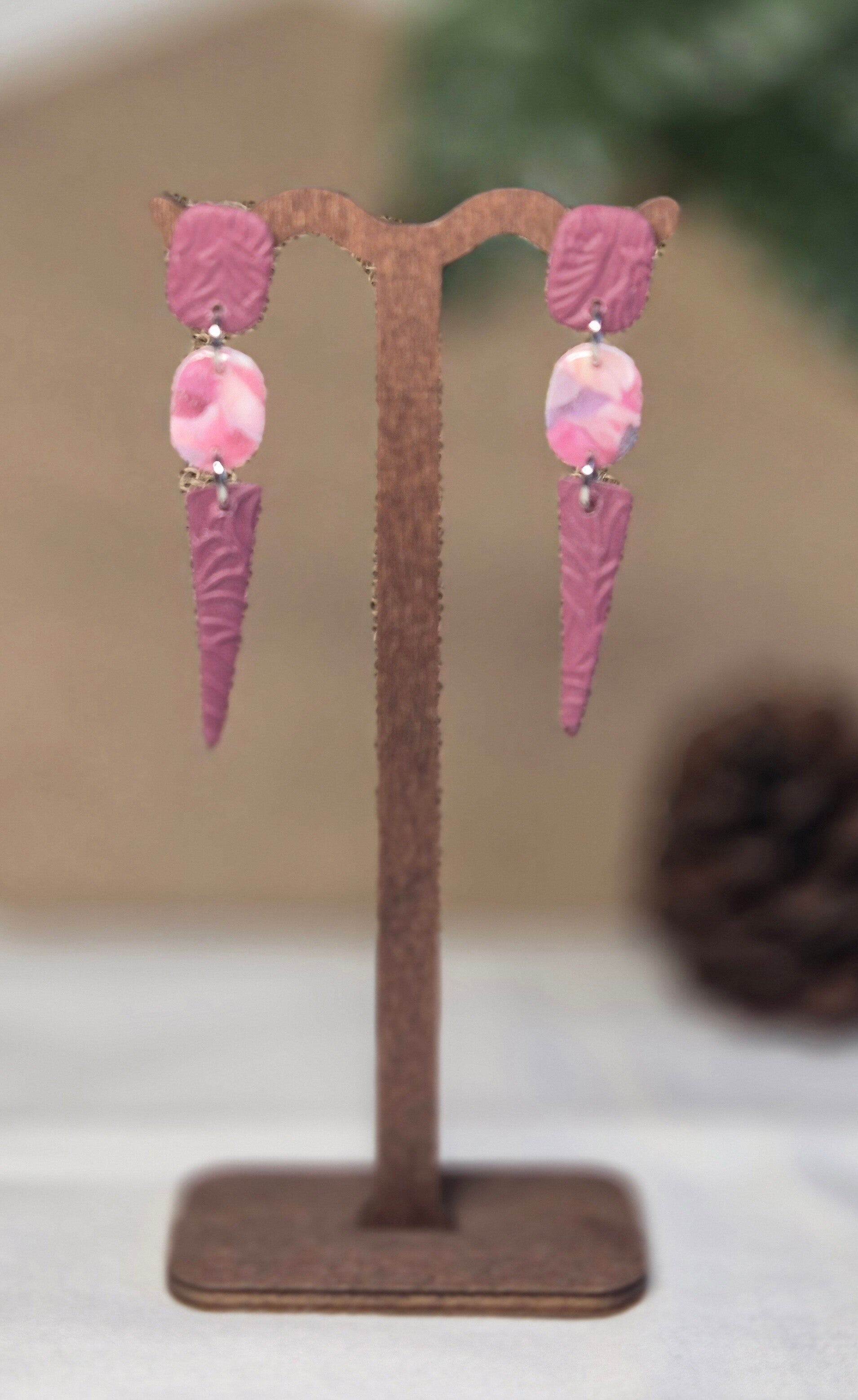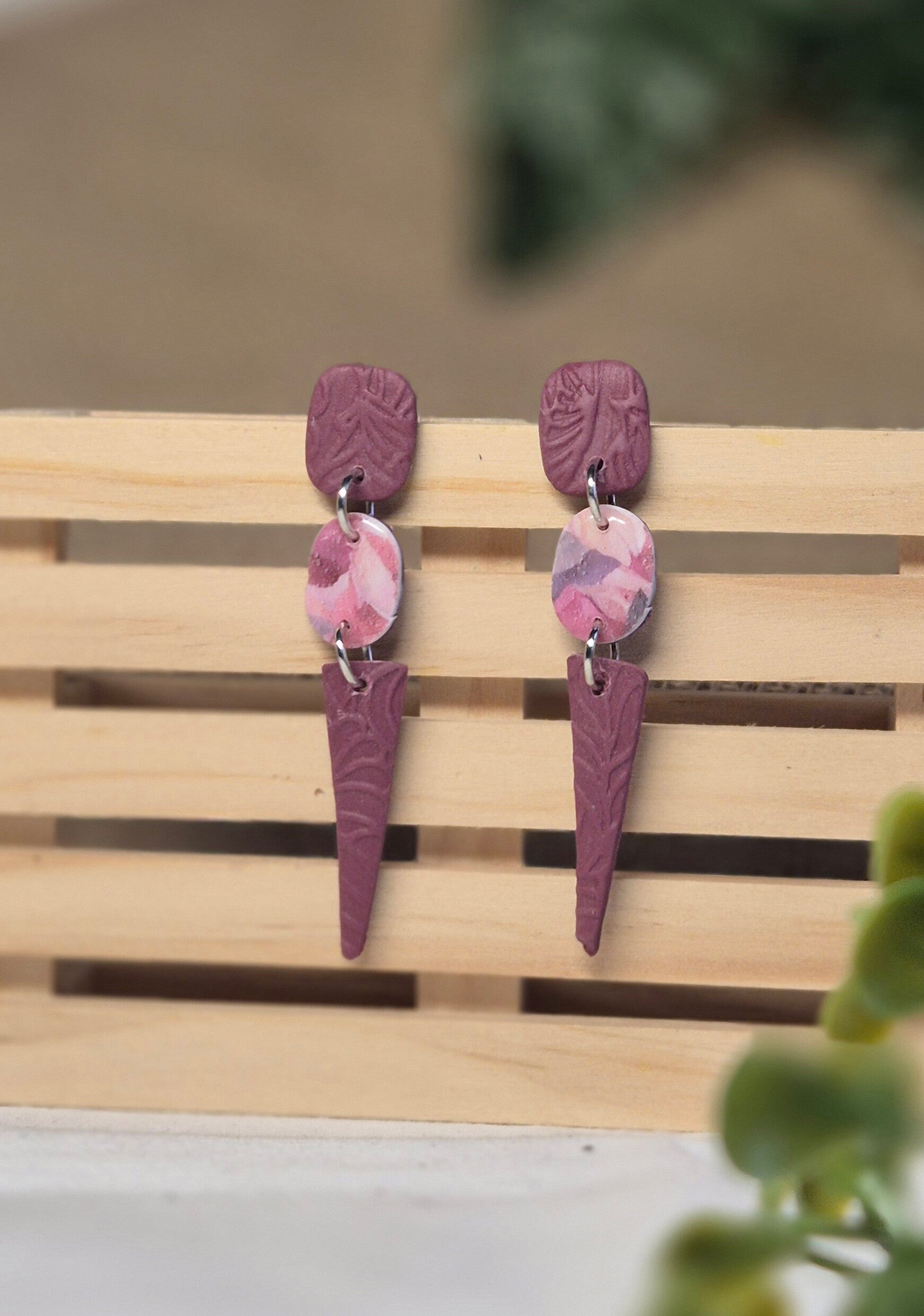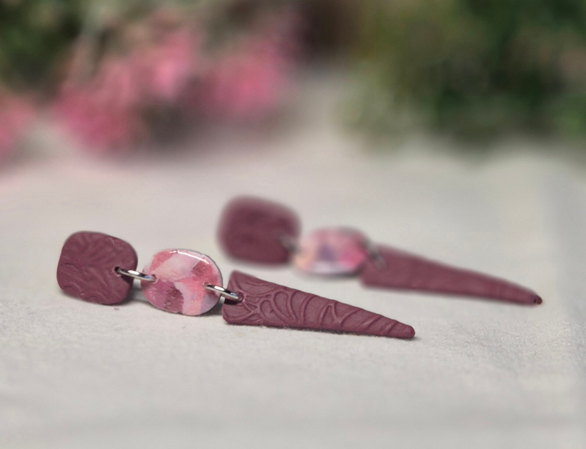 Pendientes hechos a mano con arcilla polimérica en un tono único entre guinda y vino, con una parte lisa y otra con un estampado floral delicado. Ligeros, cómodos y con ese toque especial que convierte cada pieza en un recuerdo transformado en color y forma.