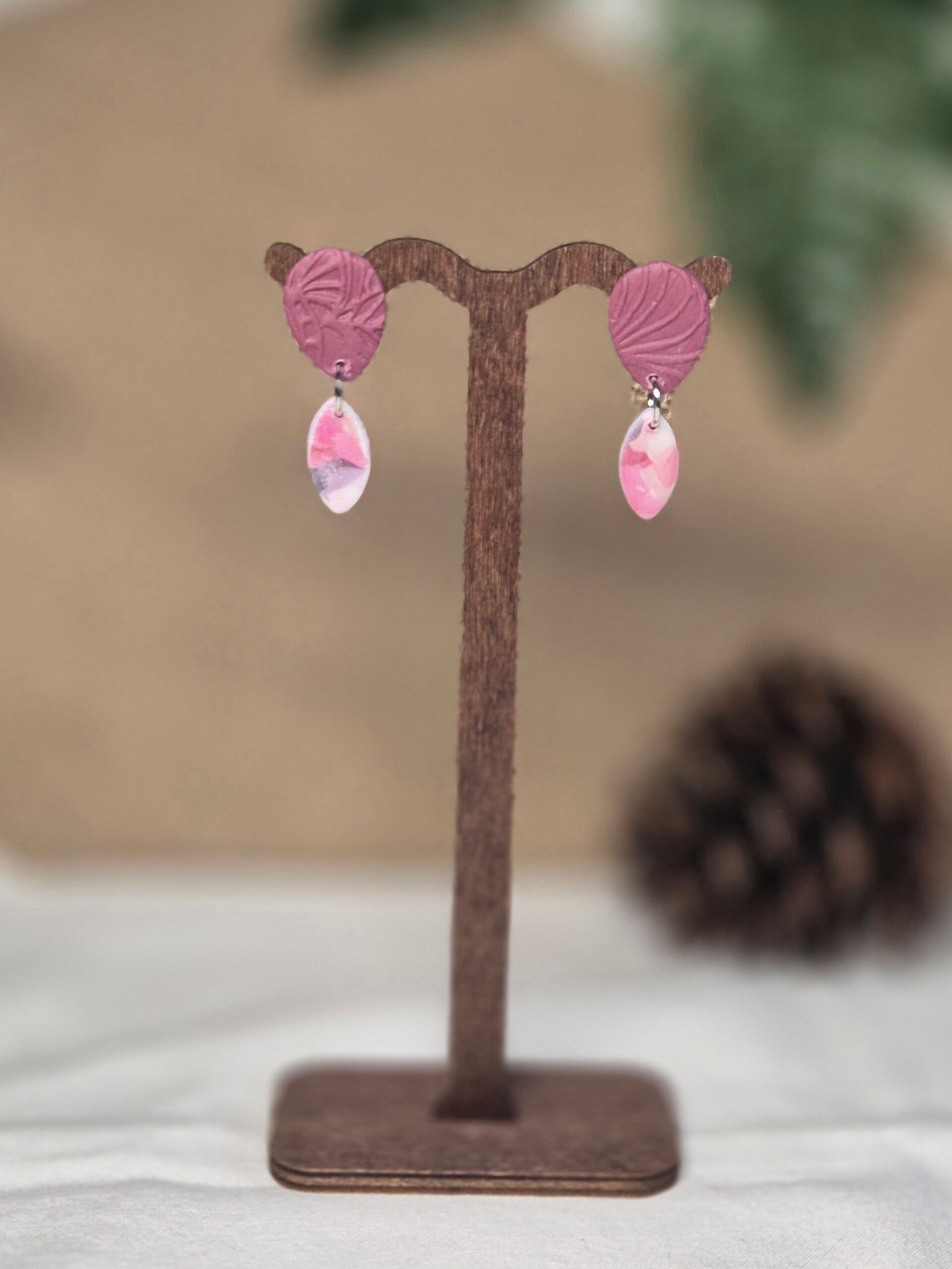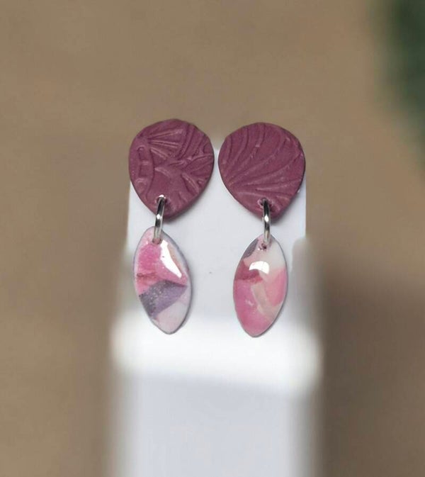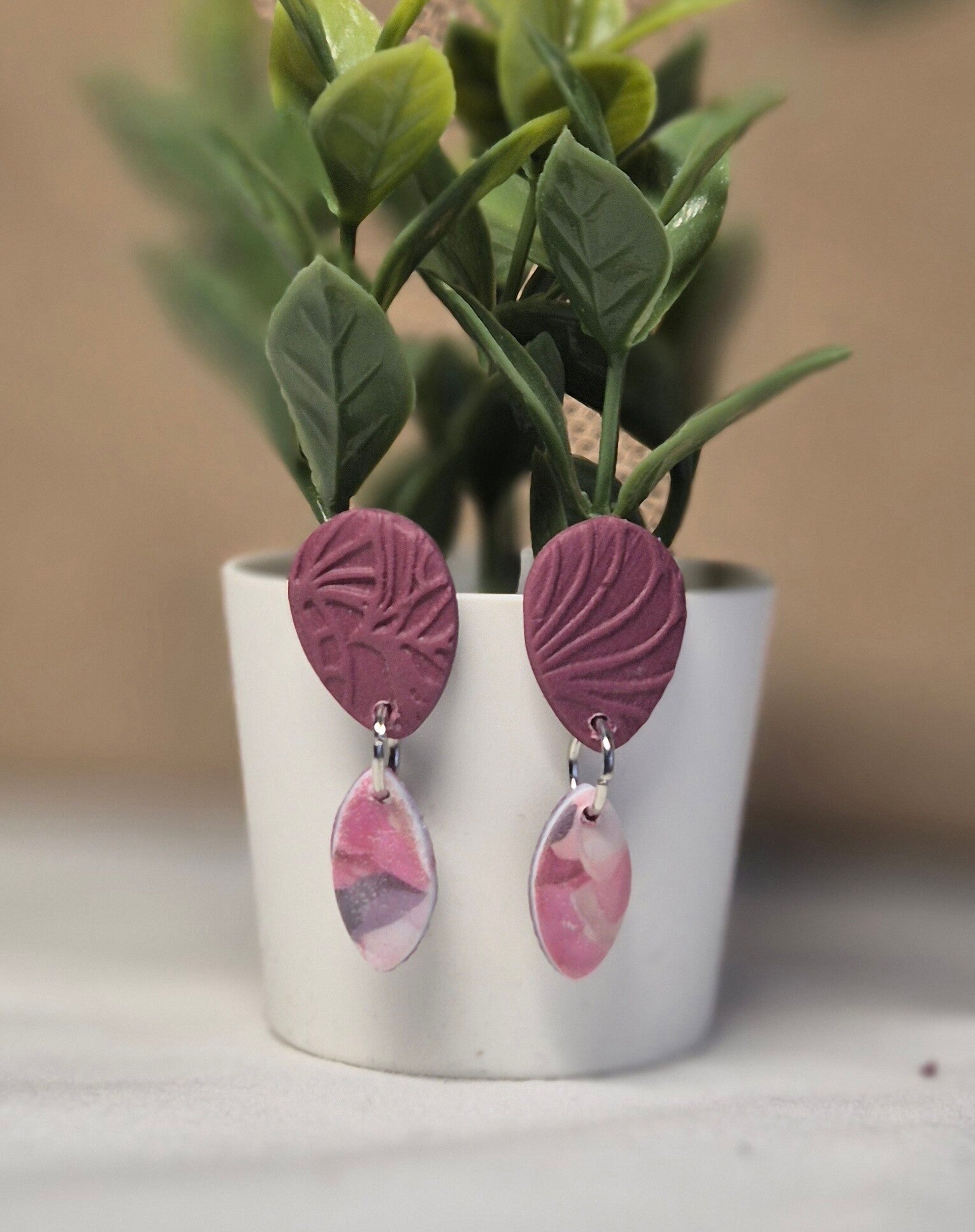 Pendientes hechos a mano con arcilla polimérica en un tono único entre guinda y vino, con una parte lisa y otra con un estampado floral delicado. Ligeros, cómodos y con ese toque especial que convierte cada pieza en un recuerdo transformado en color y forma.
