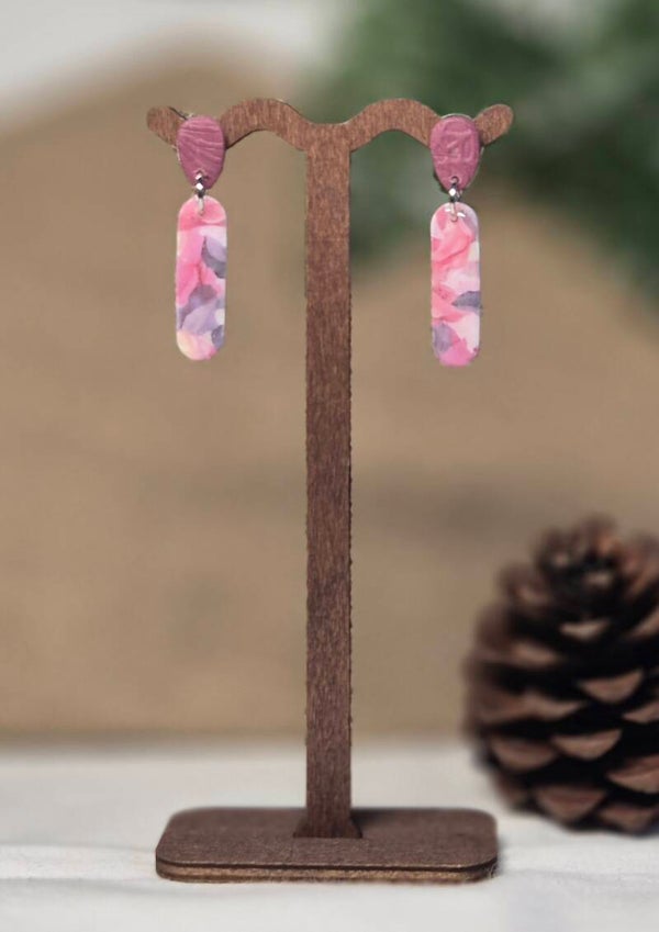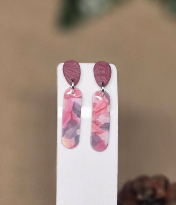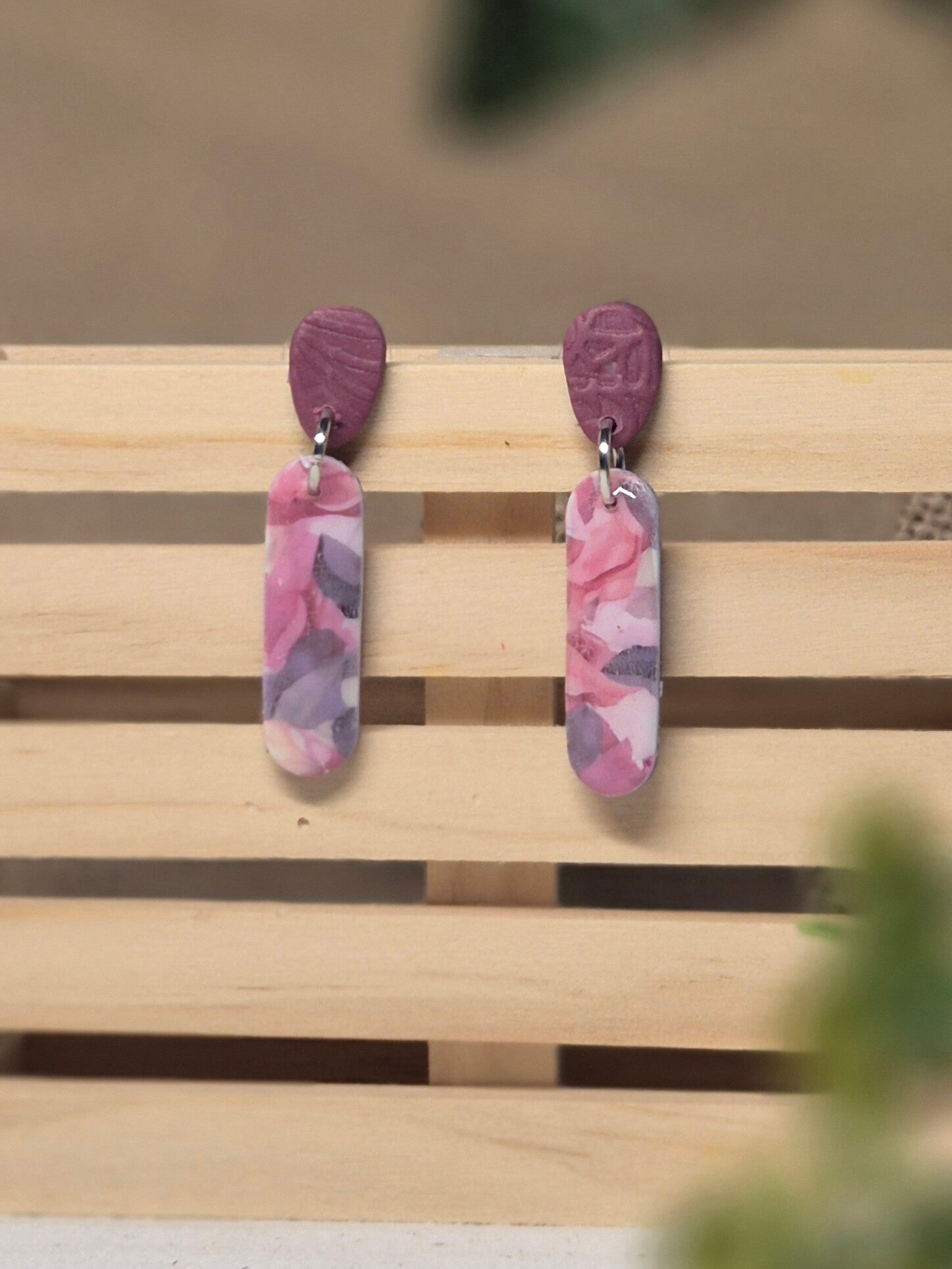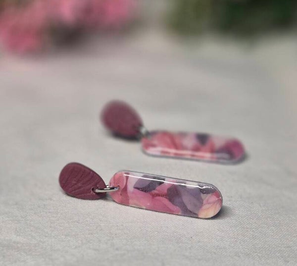 Pendientes hechos a mano con arcilla polimérica en un tono único entre guinda y vino, con una parte lisa y otra con un estampado floral delicado. Ligeros, cómodos y con ese toque especial que convierte cada pieza en un recuerdo transformado en color y forma.
