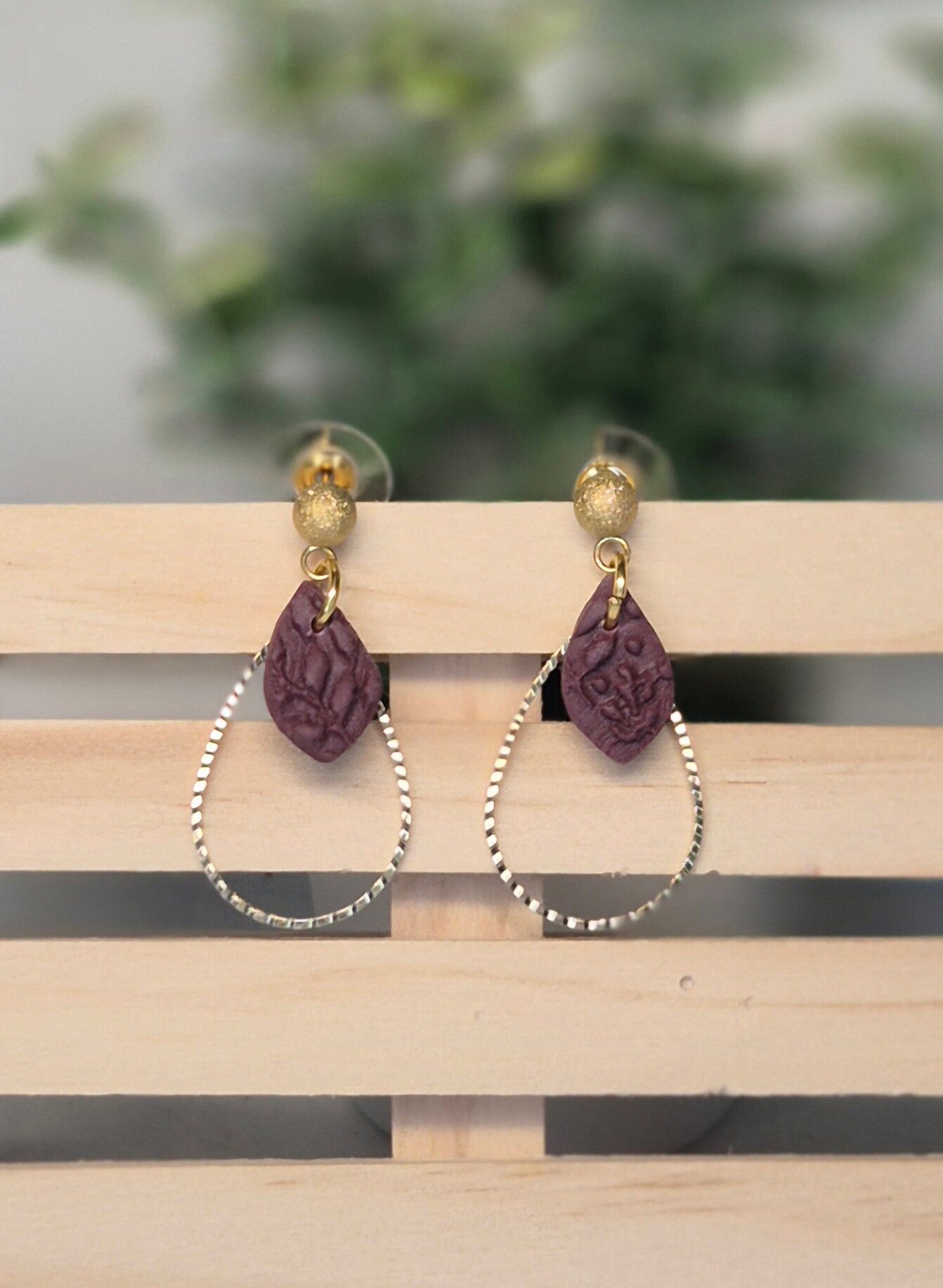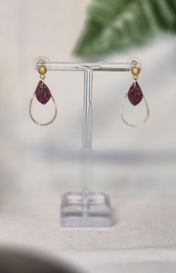 Pendientes hechos artesanalmente con arcilla polimérica en granate y con relieve vegetal, inspirado en ese color que guarda un recuerdo. Una pieza que late suave, con textura orgánica y un acabado que hace que el granate no solo se vea: se sienta.