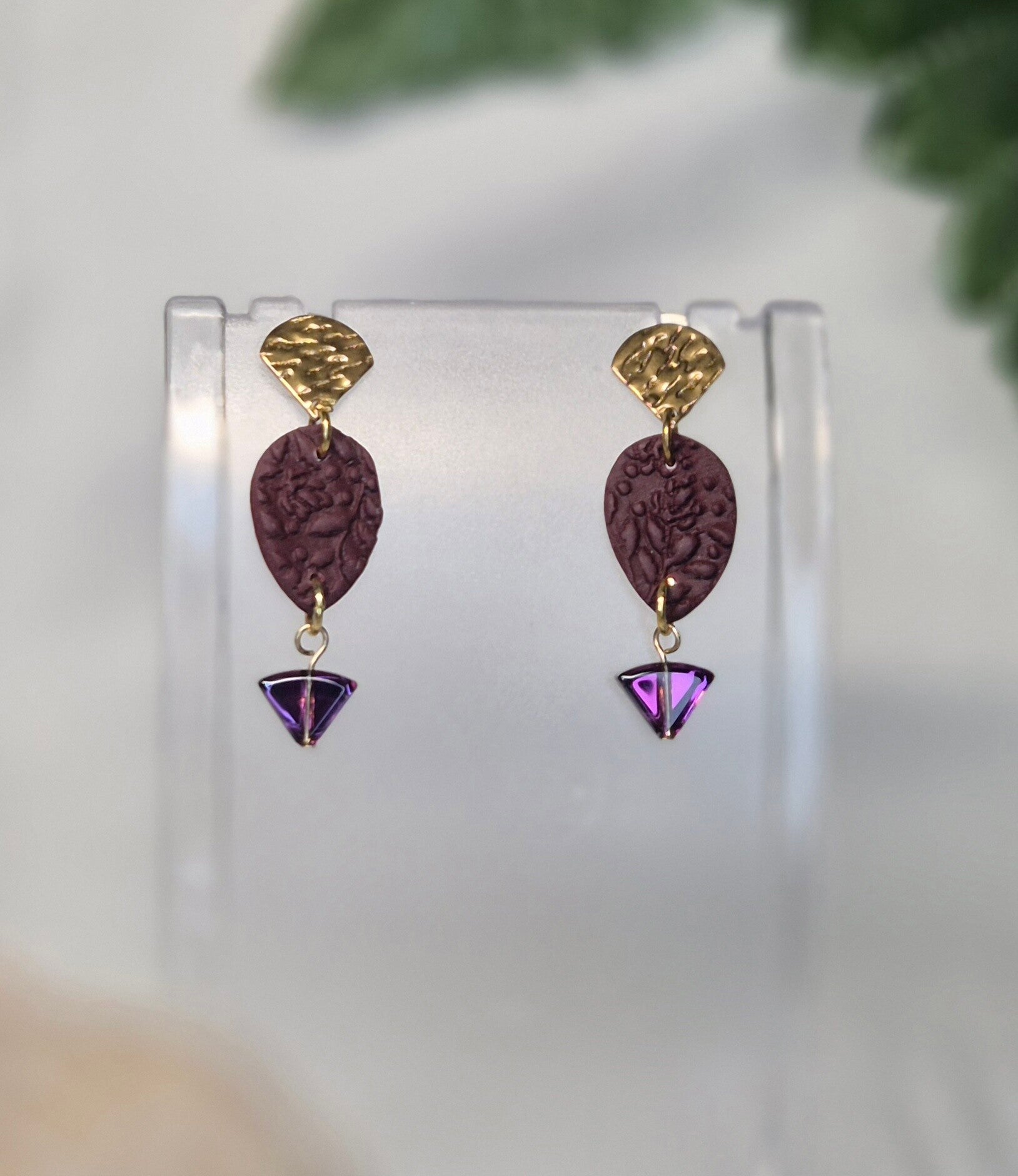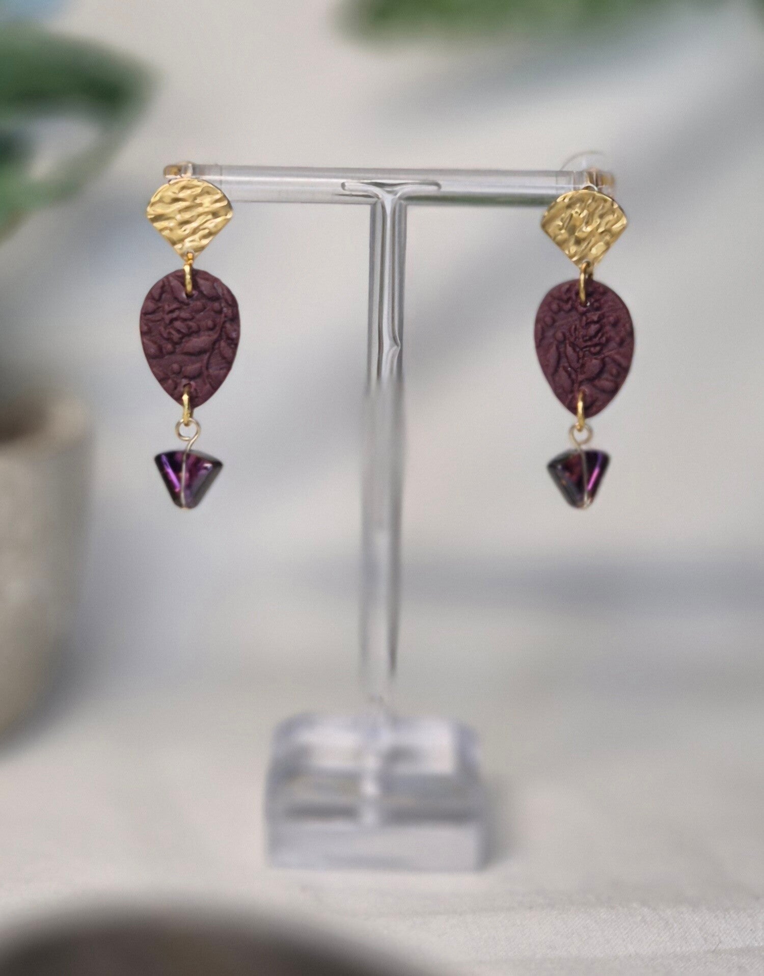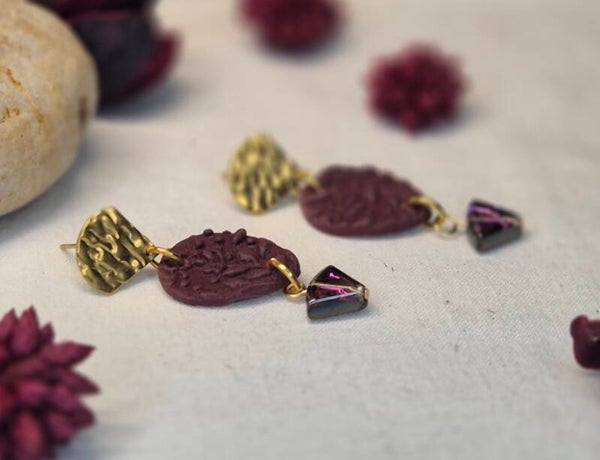 Pendientes hechos artesanalmente con arcilla polimérica en granate y con relieve vegetal, inspirado en ese color que guarda un recuerdo. Una pieza que late suave, con textura orgánica y un acabado que hace que el granate no solo se vea: se sienta.
